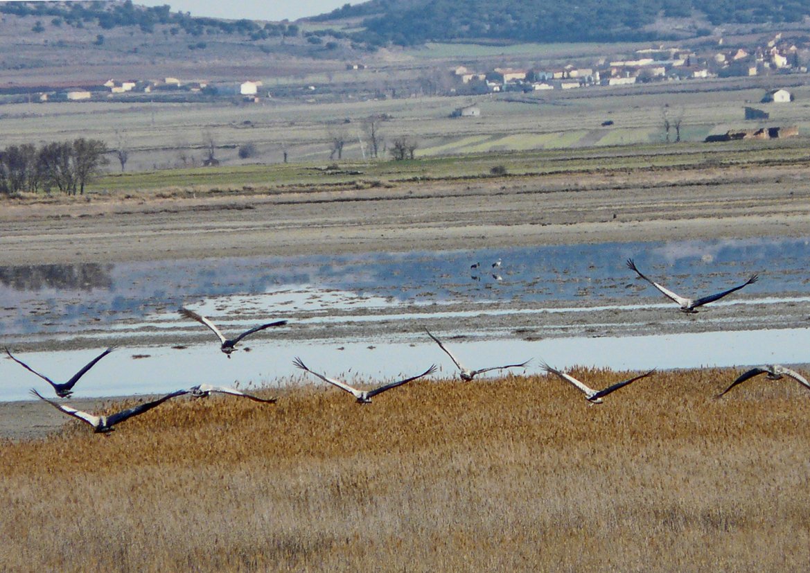 En la laguna se reúnen más de 200 especies de aves, águilas, buitres, abubillas, fochas y, su especie más emblemática, la grulla común, una majestuosa ave de patas y cuello esbelto que puede alcanzar una altura de hasta 1,2 metros y una envergadura de ala de más de 2 metros cuando las tiene extendidas.