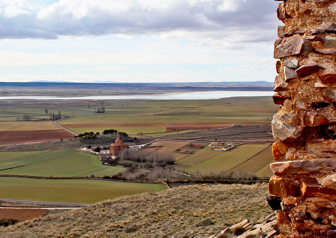 Volvemos sobre nuestros pasos al pueblo de Gallocanta, y cogemos una de las pistas que rodean la laguna, y que nos conducirá, todo lo cerca que se permite, por su ribera hasta un tramo de asfalto que lleva a Tornos. Una para en el Hostal de las Grullas, donde tuvimos ocasión de comprar miel artesanal de la tierra, y nos dirigimos hasta lo que queda del Castillo de Tornos.
