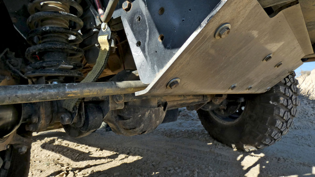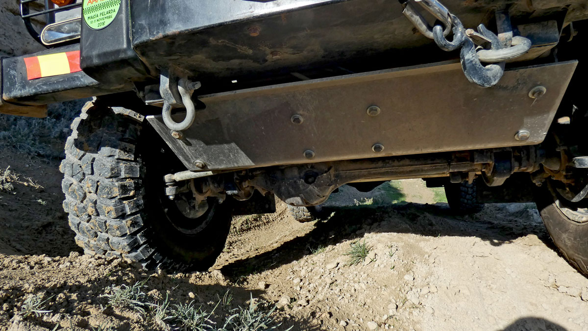 Los bajos del Defender se blindan con protecciones artesanales de duraluminio. Dirección, diferencial delantero, caja transfer y diferencial trasero quedan a salvo del golpe y proyección de piedras en las largas marchas por las duras pistas africanas.