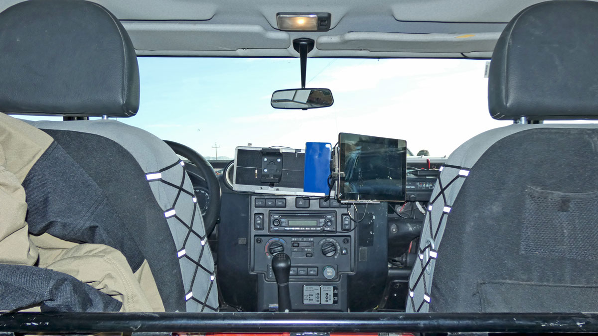 El interior del Defender recuerda más a la cabina de un avión que a un Land Rover. La lista de instrumentación es interminable, desde botoneras ARB a aparatos de navegación terrestre, interruptores y relojes de todo tipo. No vamos a nombrarlos todos, pero os dejamos una relación de los que pensamos son más destacables.