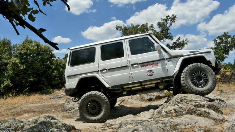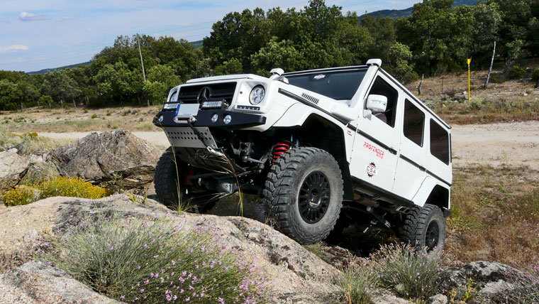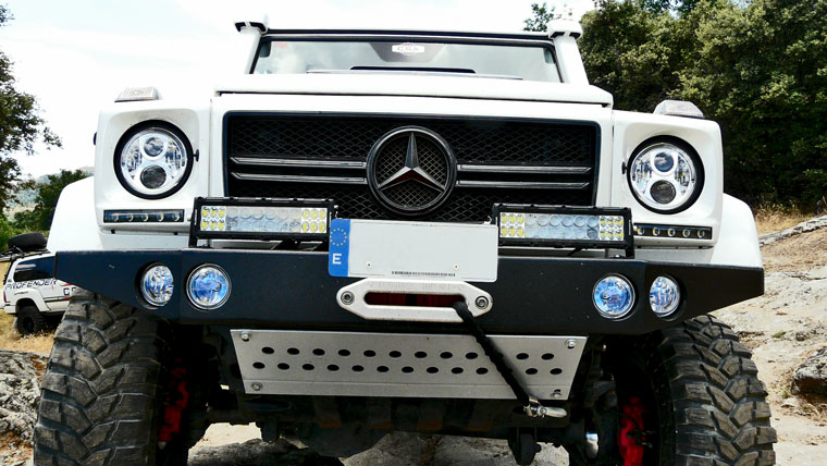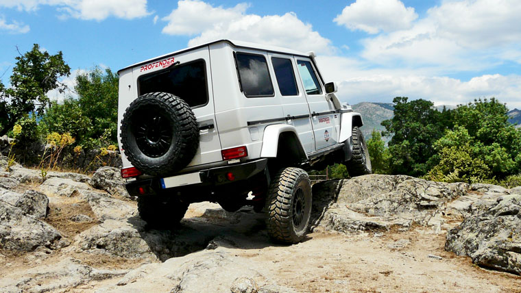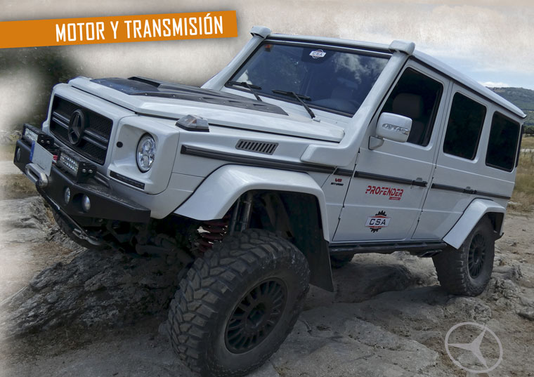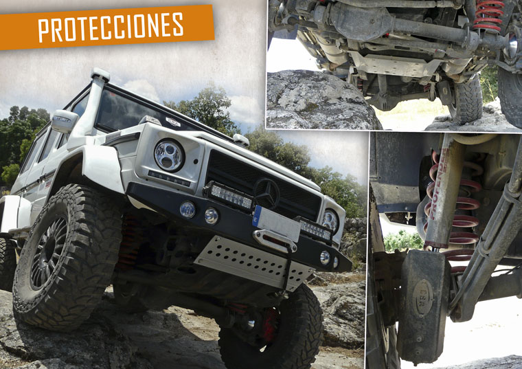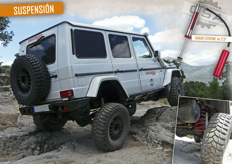 Sobre la base de un soberbio chasis de largueros con travesaños tubulares, ejes rígidos con sendos bloqueos al 100% de sus diferenciales, además del bloqueo central, el G admite algunas mejoras para aumentar su extraordinaria capacidad todoterreno.