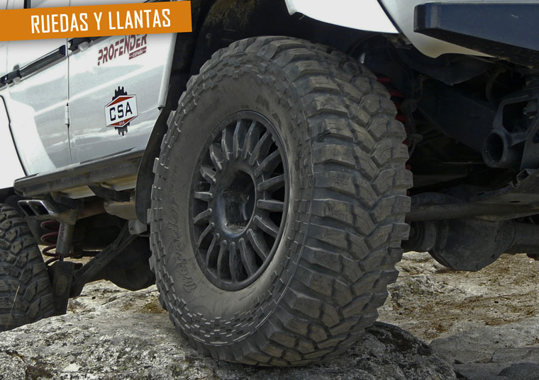 Para maximizar todo el potencial offroad del Mercedes G, los especialistas de CSA 4X4, empezaron por sustituir las llantas originales por otras más especializadas, unas preciosas BRAID 7×17 -30, fabricadas a medida según especificaciones CSA 4×4, sobre las que se montan unos efectivos neumáticos MAXXIS de medidas 35×12,5×17 con un dibujo para uso extremo, cuya banda de rodadura, única, asegura un área de contacto constante y resistente.