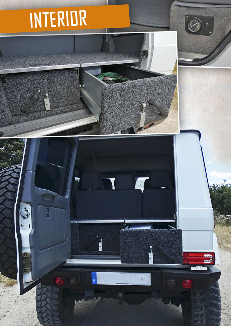 En la parte trasera, en el maletero, se ubican unas prácticas cajoneras fabricadas a mediad por CSA 4X4, muy útiles para mantener bien ordenado el equipo de rescate y las provisiones para las rutas y viajes.