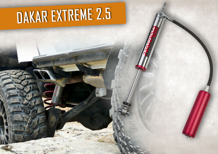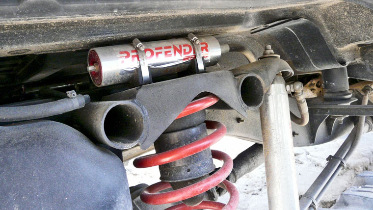 La elevación se consigue mediante unos muelles +12 cm diseñados y fabricados por CSA 4×4 y los amortiguadores de la casa, unos PROFENDER ESPAÑA modelo DAKAR EXTREME de 2,5” y botella separada.
