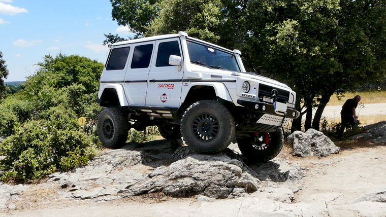 El Mercedes G400, después de ser sometido al proceso de elevación, y sustituidos los paragolpes delanteros y traseros de serie, hace gala de unos muy buenos ángulos de ataque y salida, que sumados a la altura libre al suelo que proporcionan sus neumáticos de 35”, han dado como resultado unas capacidades TT envidiables.