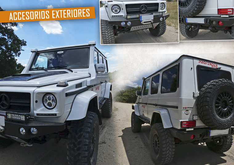 En el exterior se hace notar el intenso trabajo de preparación sobre el g400 Mercedes, además de las mencionadas tomas elevadas exclusivas de CSA 4×4, y con el afán de mejorar las ya de por sí envidiables aptitudes offroad del modelo, se han sustituido los parachoques originales por otras diseñados y fabricados por CSA 4×4, con lo que la mejora de los ángulos de entrada y salida, sumados a la altura libre al suelo, amplía notablemente la capacidad de franqueo de obstáculos del G.