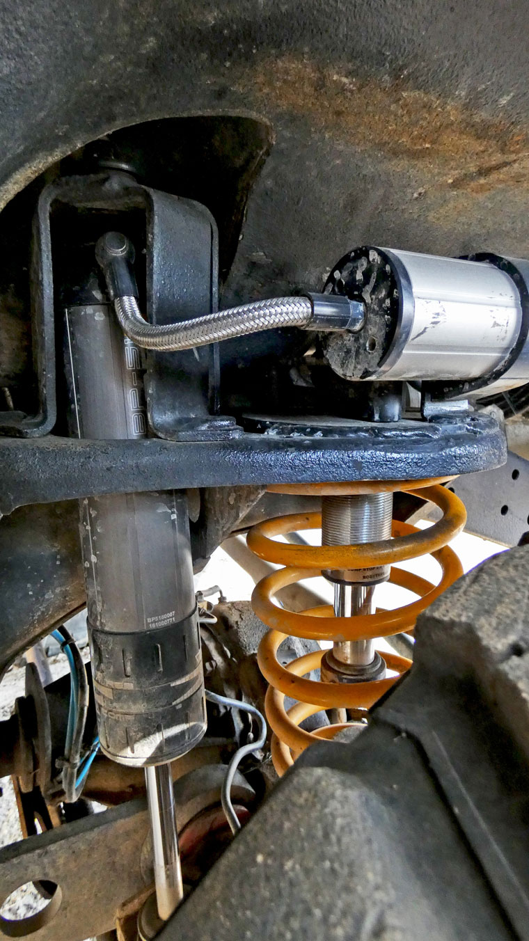 Para preservar la integridad de los amortiguadores, se han montado Bump Stop de la marca RAPTOR en ambos ejes, de 2” de diámetro y 3” de recorrido. Estos topes de suspensión hidráulica actúan en el último tramo de la suspensión evitando los topes del amortiguador al tiempo que protegen el chasis y la carrocería, o los soportes y ejes, sobre todo en la recepción de un salto o un fuerte bache.