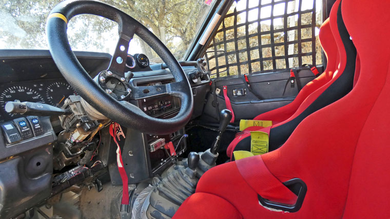 La visión del habitáculo del Patrol es la típica de un vehículo de carreras, si bien en este caso, dada la disciplina a la que se dedica, la instrumentación de navegación se limita a un GPS GARMIN 276 C, el resto es inequívocamente racing.
