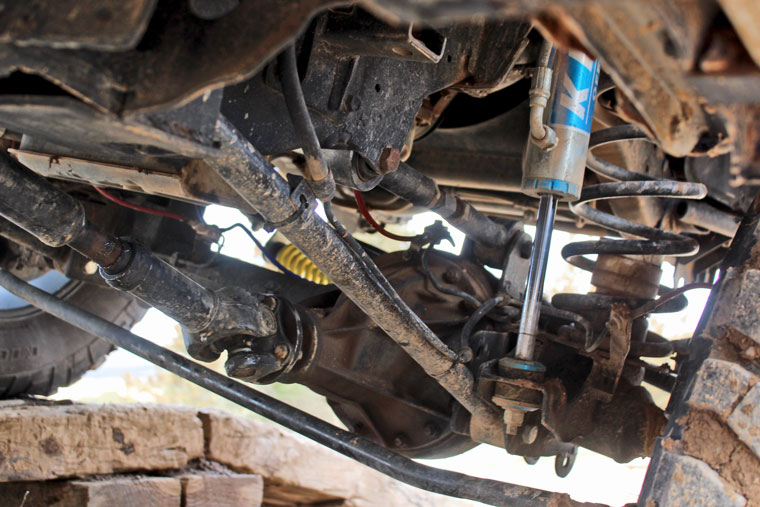 Para poder controlar las ruedas de 37” y reducir las vibraciones se sustituye el amortiguador de dirección de serie por otro con muelle TOUGH DOG