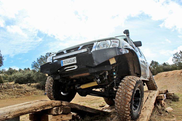 Los brazos de suspensión originales del Patrol, se han sustituido por cuatro tirantes artesanales, fabricados por Luis, dos superiores y dos inferiores, soldados en soportes ajustados a su longitud y ubicados por encima y debajo del eje, aumentando notablemente el recorrido de la suspensión. La nueva posición de los tirantes, además, corrige el ángulo del eje delantero para ajustarlo a la nueva elevación.