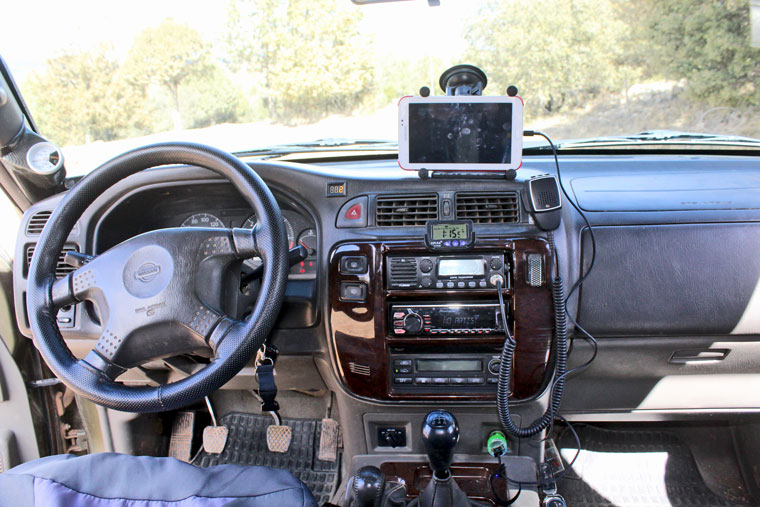 En el tablier y cuadro de mandos encontramos algunos de los dispositivos propios de la actividad offroad, por un lado está el monitor solar del TPMS que nos indica la presión de aire y temperatura del neumático; para las comunicaciones tenemos una emisora de 27 Mhz TTI, y una tablet con la app de TwoNav para la navegación y monitorización de las rutas offroad.