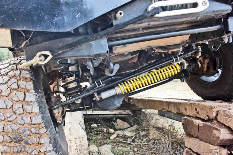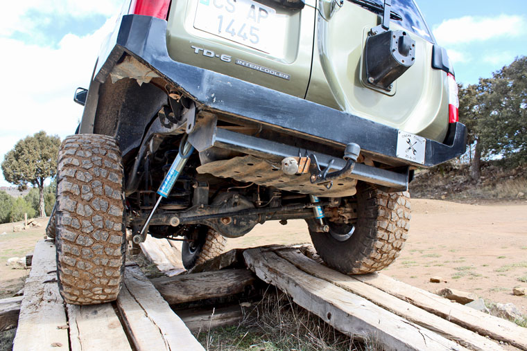 Los tirantes de suspensión se mantienen de serie, si bien la barra Panhard también se ha convertido en regulable. La estabilizadora trasera se mantiene, eso sí, se le han cambiado las bieletas por otras artesanales, reforzadas y más largas. La cardán trasera es la original.