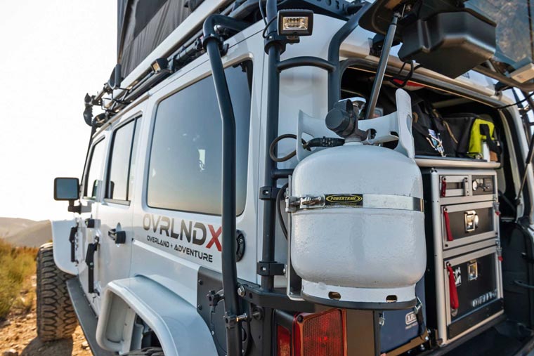 Instalé un soporte para una botella de propano Powertank, en el montante trasero, que me permite cocinar a mi gusto.