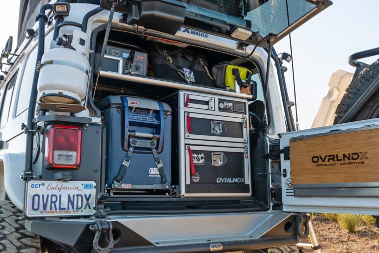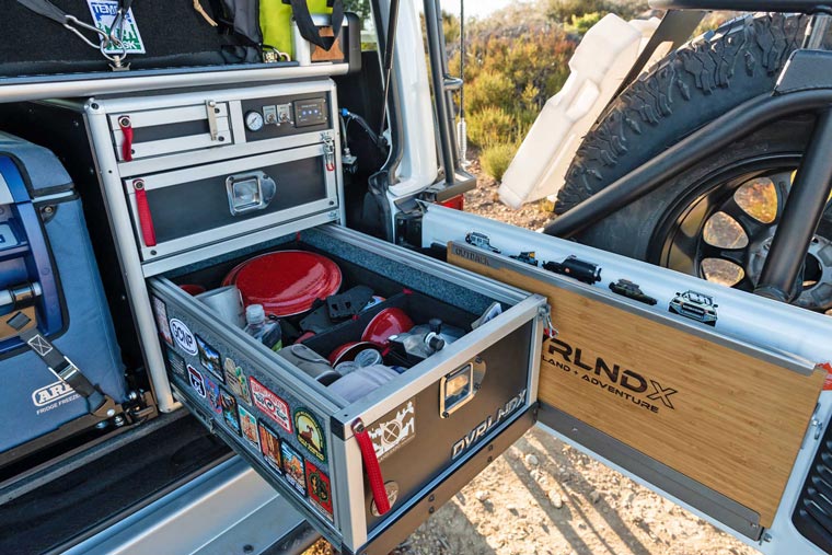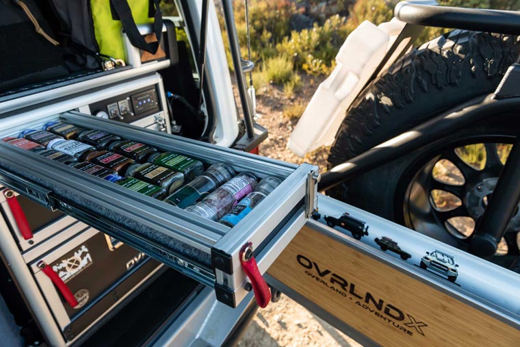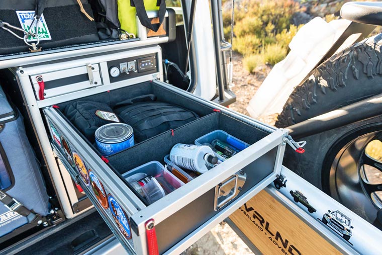 Otro elemento importante es la tienda de techo, así como el sistema de cajones en la parte posterior, que diseñé y construí yo mismo usando extrusiones de aluminio y bracketry, madera y materiales de revestimiento de alfombras.