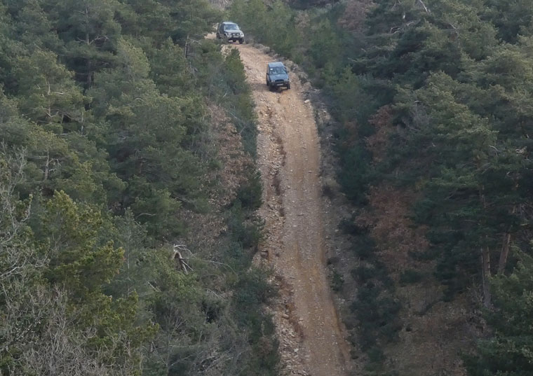 Después seguimos con rumbo norte siguiendo el plan previsto, el Terrano, el Montero y el Patrol serpean por terreno de matorrales y pastizales. Vestigios de antiguas huertas en terrazas, y los restos de corrales y parideras, y alguna antigua y destartalada caseta de labranza son testigos mudos de nuestras andanzas, hasta que nos topamos con una batida de caza mayor.