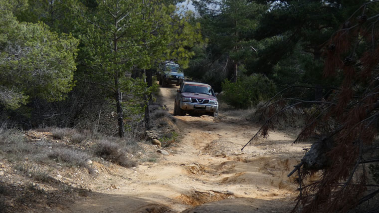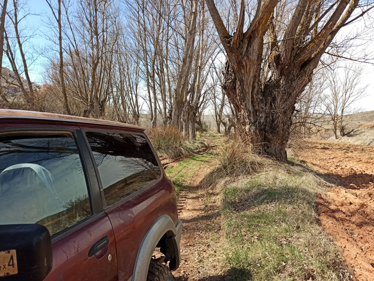 Navarrete del Río vuelve a ser nuestro punto de partida, apenas recorremos un par de kilómetros cuando los tres todoterrenos entramos en la pista que va subiendo entre el Barranco de la Peña y el Barranco del Campillo. Por el cerro, entre sabinas, buscamos la pista que viene de Lechago y va hasta los aledaños de Cutanda.
