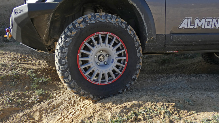 Sobre las llantas en cuestión se montan los nuevos neumáticos de Bf Goodrich, los Mud Terrain KM3 en medidas 265x70x17.