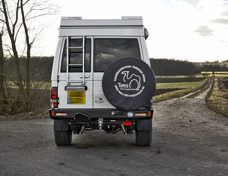 Podemos optar por el parachoques trasero TOM’s con soporte de rueda de repuesto giratorio y luces traseras incluidas, y soporte giratorio para jerrycans, en la versión Premium.